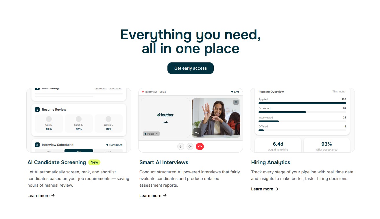 Hiring is slow, expensive, and stressful. Teams juggle job boards, email, spreadsheets, and calendars, leading to bias, inconsistent evaluation, candidate drop-off, and long time to hire. Startups needed a single, reliable system that reduces cost and effort while keeping humans in control.